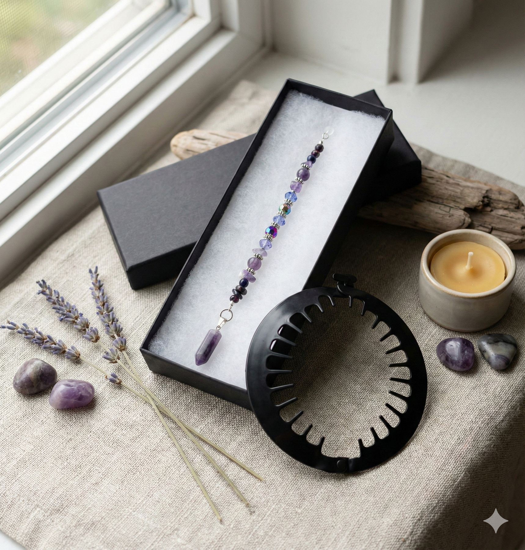 Amethyst energy leads the way in Violet Calling, a bold charm created to stir the soul. A curated mix of gemstones in deep purples, silvers, and iridescent hues draw the eye down to a single faceted point — sharp, elegant, intentional. This piece speaks to intuitive strength and quiet depth. Secured with a silicone jump ring, this handmade charm slides onto your PuffCuff without tension. Gift-boxed and ready to call you into deeper presence.