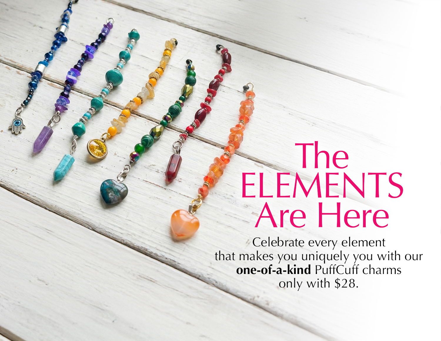 The ELEMENTS Collection was born from a powerful source — you. Sparked by real customer feedback, each PuffCuff charm in this collection is thoughtfully crafted to reflect an emotional or energetic quality through rich colors, textures, and natural materials. These accessories are more than adornment — they’re wearable reminders of your inner power, calm, courage, and creativity.