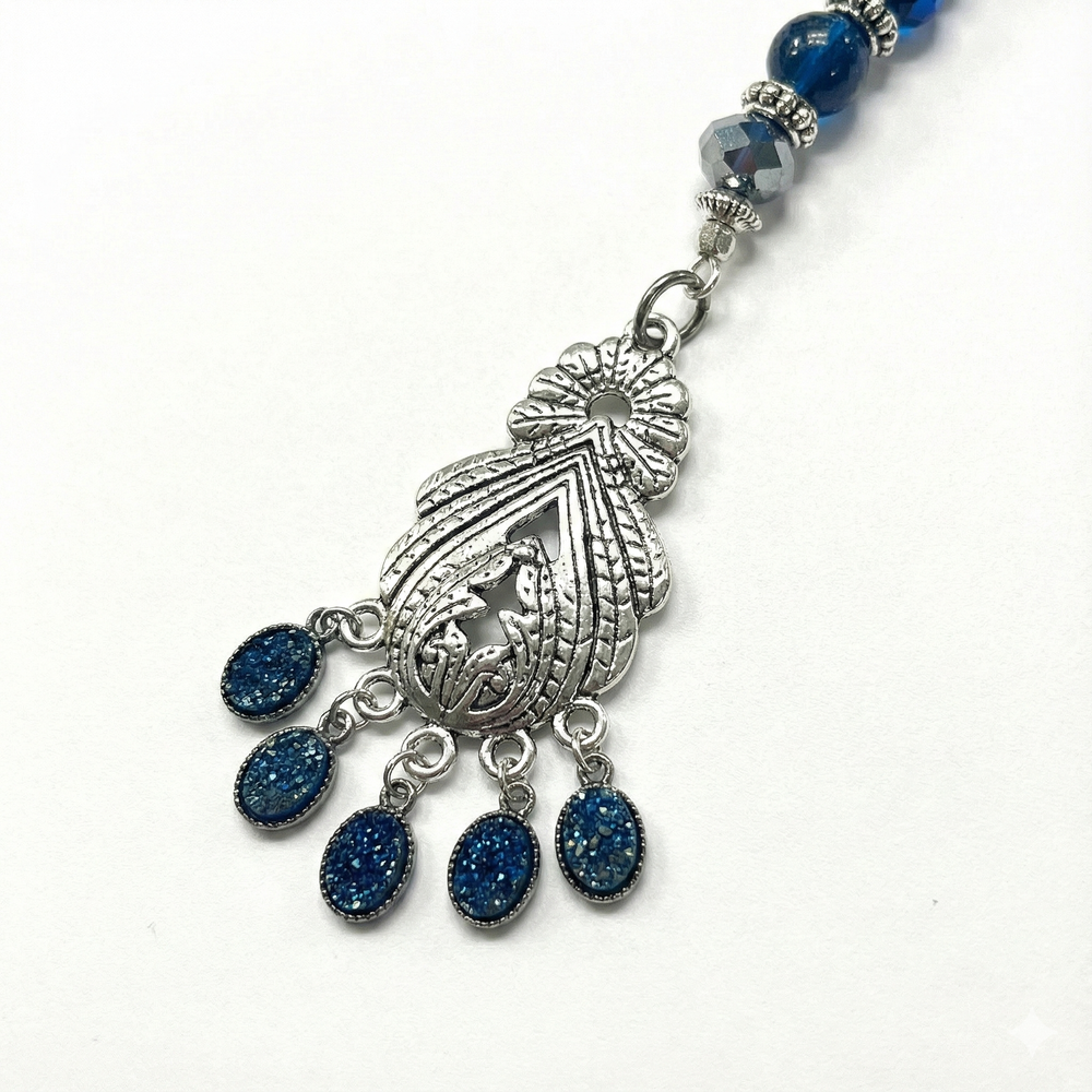 Midnight Echo brings cool depth and celestial shimmer. With rich navy beads, a luminous central accent, and a silver charm that dances with every step, this piece adds quiet power to your PuffCuff. Designed to slide onto the tooth of your PuffCuff with a silicone jump ring, it stays securely in place with no tension on your hair or cuff. One of a kind, gift-boxed, and made to stand out.