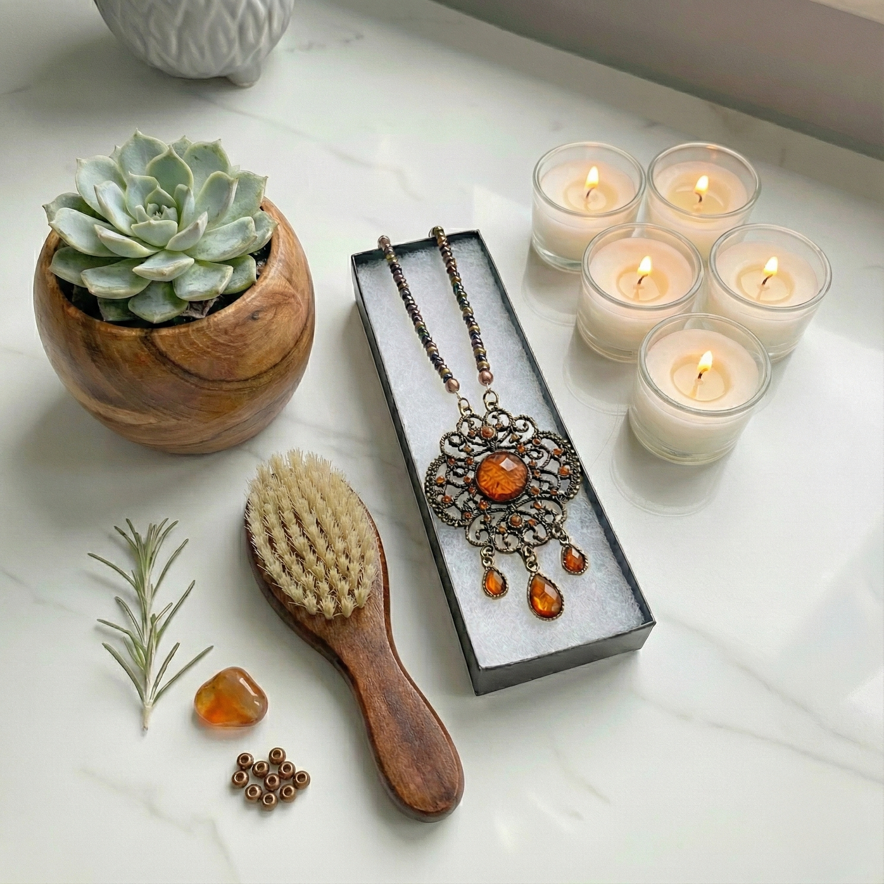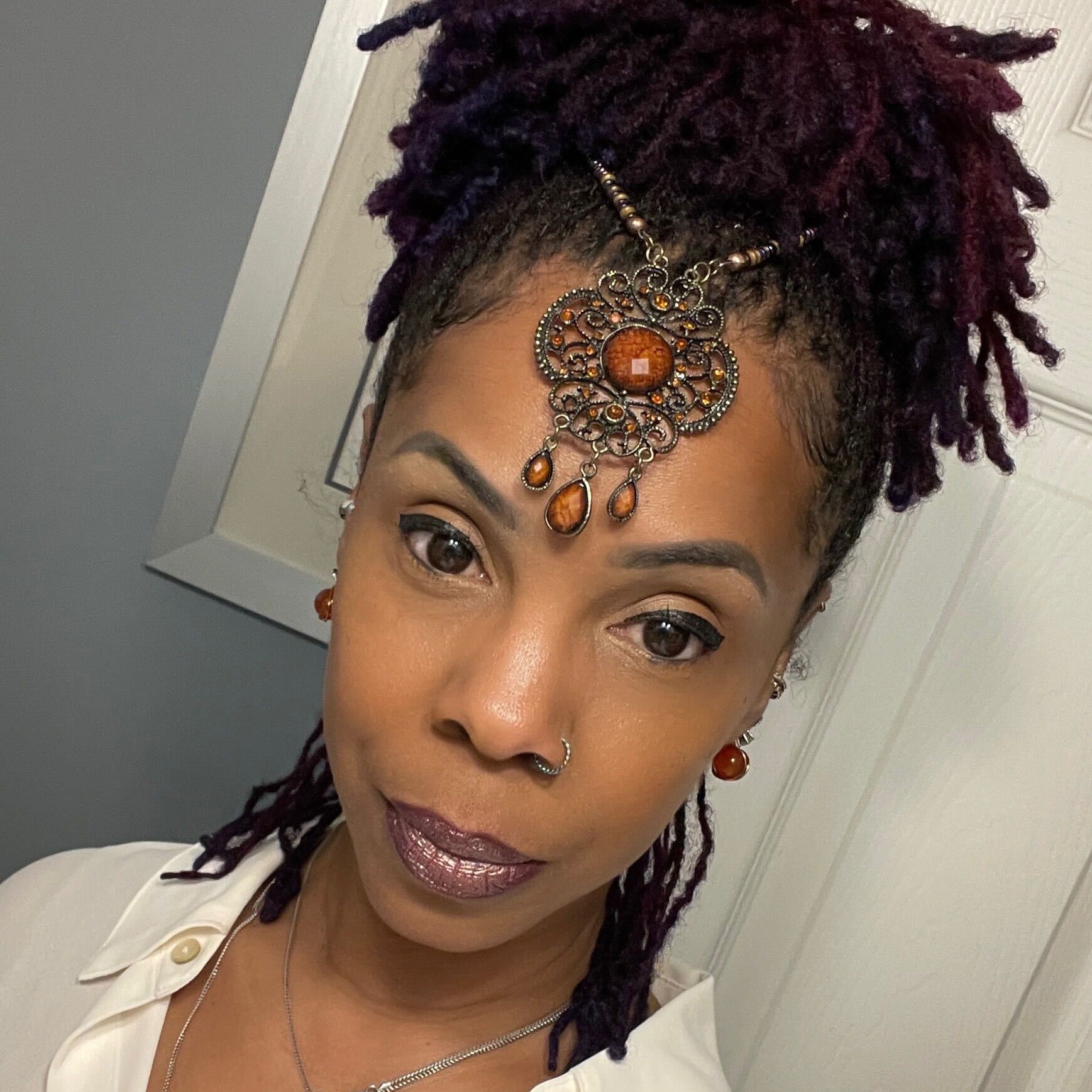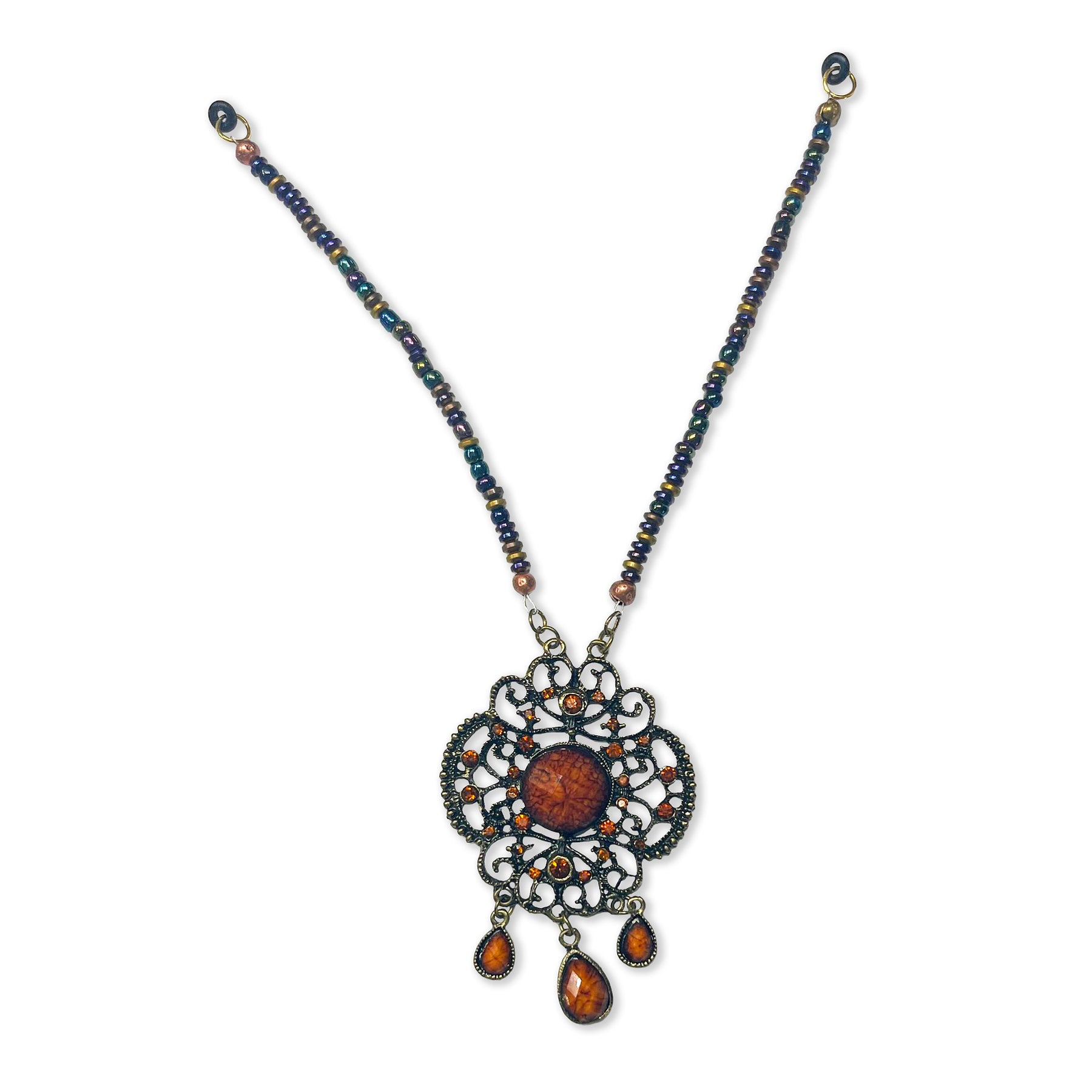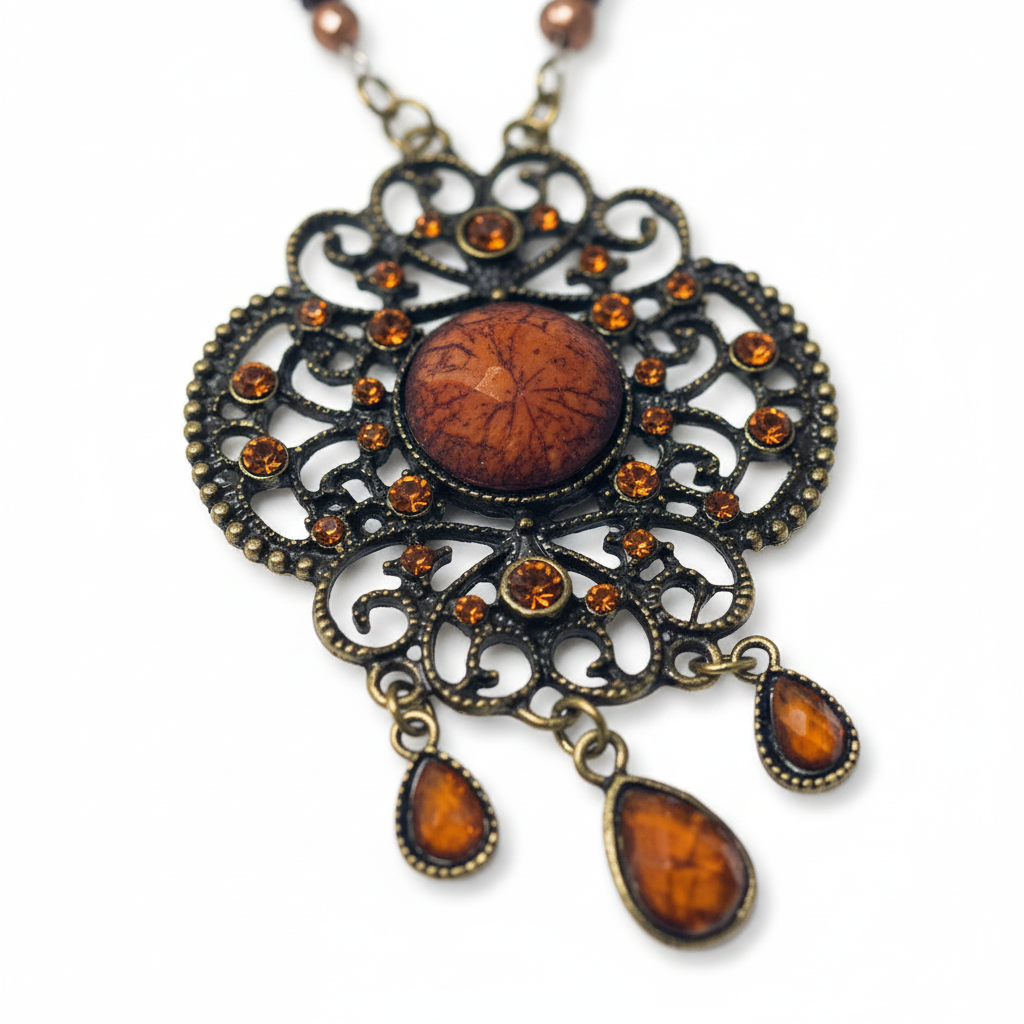 Rich amber tones and ornate detailing come together in Solar Majesty, a statement charm handmade to reflect confidence, warmth, and commanding presence. Featuring an intricate medallion centerpiece with cascading gemstone drops, this piece brings movement and depth to your crown. Designed to slide onto the tooth of your PuffCuff with a silicone jump ring, it stays securely in place with no tension on your hair or cuff. One of a kind, gift-boxed, and made to stand out.